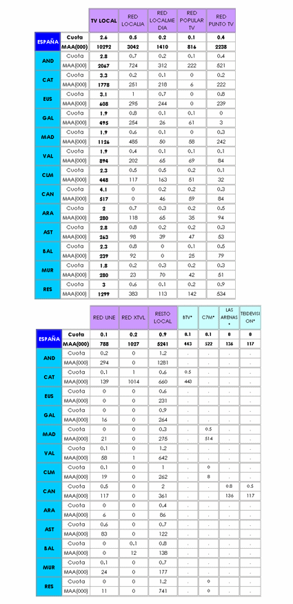La red de emisoras de Localia vuelve a liderar de nuevo el mercado local. Con un 0,5% de share con respecto al "Total televisiones" y 3.042.000 espectadores que contactan diariamente, aventaja al resto de redes locales: Punto TV (0,4% y 2.238.000), a Local Media (0,2% y 1.410.000), y a XTVL (0,2% y 1.027.000). Asimismo, destaca en Cataluña la fortaleza de la red XTVL (1.014.000) y de BTV (443.000). Otras cadenas cuya información desglosa TNSofres son las madrileñas Canal 7 (514.000 televidentes diarios), y las emisoras canarias Las Arenas (136.000) y Teide Visión (117.000).
