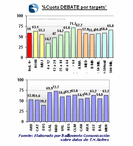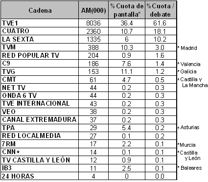 La audiencia pudo seguir también el debate en numerosas televisiones locales así como en varias cadenas TDT, en emisoras de radio e internet. La tabla siguiente detalla los datos obtenidos por las diferentes emisoras del debate actualmente sujetas al estudio de T.N.Sofres en la franja de referencia 22:07-23:52 horas (se excluyen las cadenas cuyos datos no están publicados por T.N.Sofres):