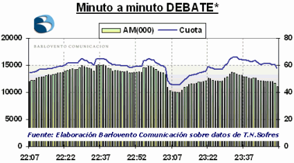 El debate moderado por Manuel Campo Vidal fue seguido mayoritariamente por TVE1, que logró aglutinar una audiencia media de 8.036.000 de televidentes con el 36,4% de share (61.7% sobre el total del debate).
