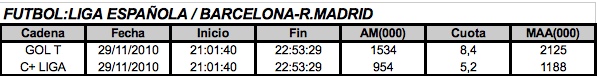 Si en el partido el equipo catalán fue el que se llevó al gato al agua aplastando a su rival madrileño, algo similar, aunque menos contundente, fue el duelo entre las dos plataformas que ofrecieron el encuentro a sus abonados: el canal catalán GolTV se impuso al madrileño Canal+ Liga.