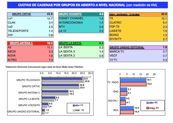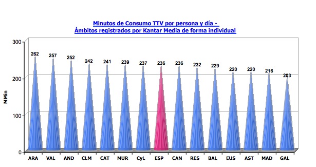 Es el mes de abril que de promedio más tiempo ha pasado cada español viendo televisión, con una media diaria de 236 minutos, 19 minutos menos que en el mes de marzo, y 9 minutos más que en abril del 2010.