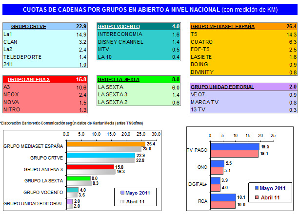 Telecinco (14,3%) sube 1,2 puntos al resultado de abril y se mantiene como segunda cadena más vista. El canal es líder entre las mujeres, el grupo de 13 a 44 años (jóvenes y adultos jóvenes) y el "target comercial", así como entre las regiones de Andalucía, Canarias y País Vasco. Consigue imponerse también durante las jornadas de lunes, miércoles, jueves y viernes y en las franjas de tarde (17:00-20:30h) y noche II (24:00-02:30h). Sus mayores ganancias se dan en la jornada de los jueves, gracias a "Supervivientes", y en las franjas de "prime-time" y "late night". El primer programa de la presente temporada de 'Supervivientes' el día 5, es la emisión más vista en el mes con una audiencia media de 3.812.000 televidentes y el 26,7% de cuota de pantalla.