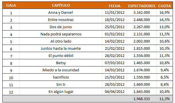 Aún así, los datos no han acompañado y han continuado bajando, con un mínimo de un 8,5% y poco más de un millón y medio de espectadores en el décimo episodio. Finalmente, ha promediado un débil 11,3% con menos de 2 millones de seguidores.