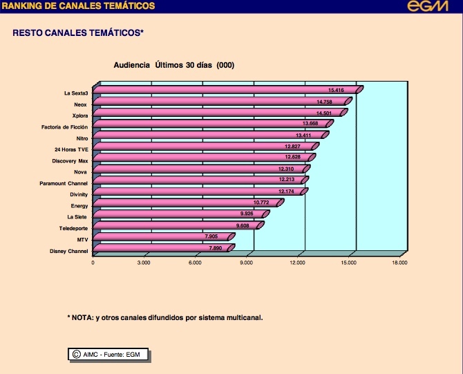La suma de la totalidad de las cadenas temáticas consigue encabezar el ránking por encima de Antena 3. Exactamente acumulan un 22,7%, seis décimas menos que en el periodo anterior. laSexta3 continúa siendo junto a Neox y Xplora las cadenas temáticas más vistas según recoge el EGM. A continuación, le siguen FDF, Nitro y el Canal 24 Horas.
