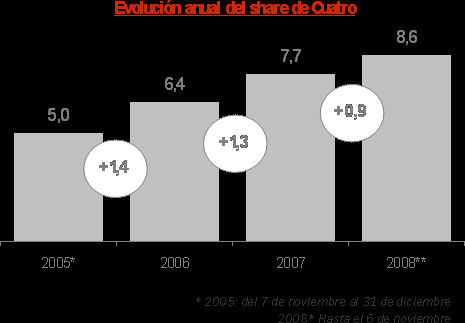 Desde entonces, Cuatro no ha dejado de crecer. En 2005, con tan sólo dos meses de emisión, consiguió un 5,0% de share imponiéndose a La 2 (4,8%). El año siguiente elevó su rendimiento en un 28,0% y se estableció en un 6,4% de cuota, y en 2007 volvió a experimentar una subida de más del 20,0% y firmó un 7,7%. En 2008, Cuatro alcanza ya un 8,6% y supera en más de tres puntos en su dato anual acumulado tanto a La 2 (4,6%) como a laSexta (5,4%).