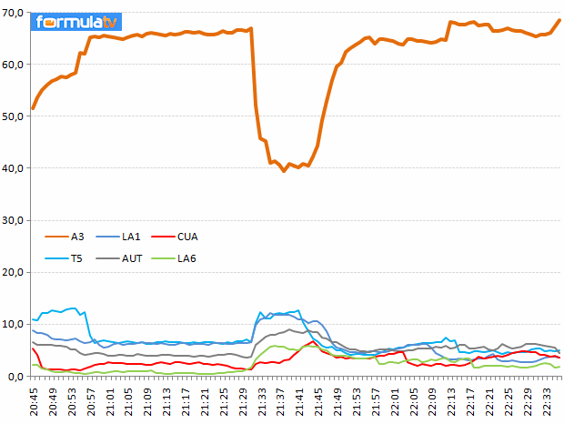 El partido de la final mantuvo un apabullante liderazgo incluso durante la publicidad, no bajando de cuotas del 40% de share y rozando el 70% durante la mayor parte del encuentro:
