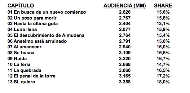 El primer capítulo de la serie se estrenó con un buen dato: 15,6% y 2.626.000 espectadores. Buen dato pero por debajo de lo esperado por la cadena, dado que en ese miércoles no competía contra grandes productos en otras cadenas. Antena 3 emitía la primera parte de la TV movie sobre la vida del cantante Raphael que se quedaba a poco menos de dos puntos de distancia.