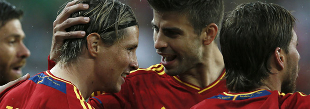 Fernando Torres recibe la felicitación de sus compañeros de equipo tras su primer gol ante Irlanda. <span>Telecinco</span>