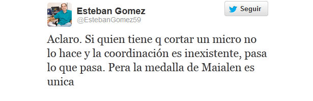 Además, Gómez, tras observar el revuelo formado, ha querido aclarar su comentario en la conocida red social: "Aclaro. Si quien tiene que cortar un micro no lo hace y la coordinación es inexistente, pasa lo que pasa". "Pero la medalla de Maialen es única", ha concluído Esteban Gómez.