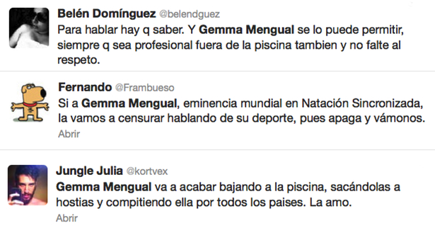 Evidentemente, no todos los comentarios que recibió la participación de Mengual fueron negativos, algunos usuarios de Twitter entendieron que en los deportes tan técnicos como la natación sincronizada los comentarios de los expertos pueden parecer muy duros para aquellos que no entienden al 100% el reglamento.