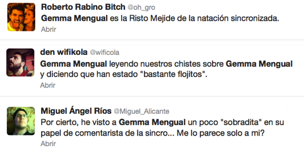 La estrategia de Televisión Española de nutrir las retransmisiones deportivas de los Juegos Olímpicos de Londres 2012 con deportistas españoles no está dejando indiferente a nadie. Si hace unos días era el nadador Javier Soriano el que daba la campanada al ser aclamado por el público por su labor detrás del micrófono, es ahora otra nadadora, Gemma Mengual, la que recibe todos los titulares, y en esta ocasión no son precisamente positivos.