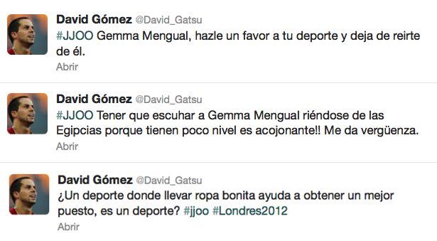 David Gómez no dudó en ser muy critico con la nadadora, a la que llegó a aconsejar que hiciera un favor a su deporte y se dejara de reír de él. Pese a que él fue el primero en desprestigiar la natación sincronizada con un tweet en el que preguntaba: "¿Un deporte donde llevar ropa bonita ayuda a obtener un mejor puesto, es un deporte?"
