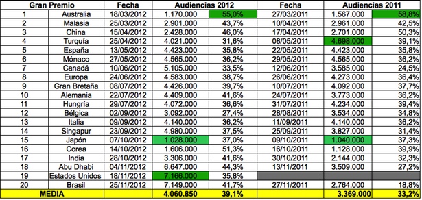 En este sentido, ningún gran premio de la Temporada 2011 consiguió superar la cifra de 5 millones de espectadores. Todo lo contrario a lo sucedido con esta temporada que arrasó en espectadores en numerosos circuitos. De los 20 que comprendía este mundial, cuatro G.P. consiguieron superar la barrera de los cinco millones e incluso aumentar de forma significativa esta cifra: Estados Unidos, 7.166.000; Brasil, 7.149.000; Abu Dhabi, 6.647.000 y Canadá, 5.105.000.