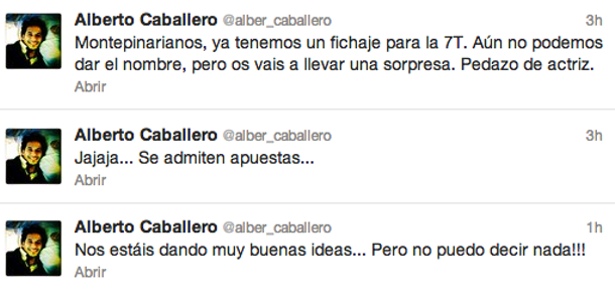Este viernes, el creador de 'La que se avecina' ha vuelto a hacer uso del pájaro azul para dar a conocer una nueva noticia sobre la séptima temporada. "Montepinarianos, ya tenemos un nuevo fichaje para la 7ª temporada. Aún no podemos dar el nombre, pero os vais a llevar una sorpresa. Pedazo de actriz". Con este tweet, Alberto Caballero dejaba en el aire las insinuaciones sobre la nueva incorporación a la serie cuya identidad recae en una gran actriz del panorama español.