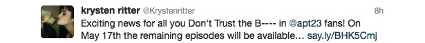 Krysten Ritter: "¡Noticias emocionantes para todos los fans de 'Don't Trust the B---- in Apartment 23'! Los episodios restantes de la serie estarán disponibles a partir del 17 de mayo." La continuación en Whosay dice:"la web de ABC, iTunes y Hulu! No puedo esperar a que los veáis. Os quiero."