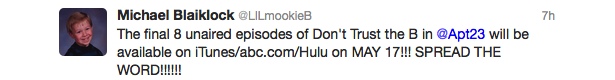 Michael Blaiklock: "¡Los últimos 8 episodios de 'Don't Trust the B---- in Apartment 23' estarán disponibles a través de iTunes y Hulu a partir del 17 de mayo! ¡Corred la voz!".