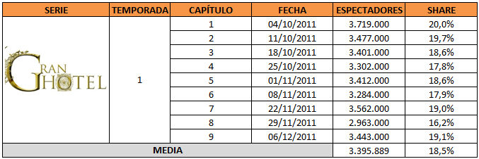 'Gran Hotel' se ha convertido en una de las series más destacadas de los últimos años no solo a nivel de crítica, sino también en audiencias. La ficción de Antena 3 ha emitido tres temporadas con 39 capítulos, en las que ha logrado una audiencia muy fiel que, si bien no ha conseguido los astronómicos datos de otros productos como 'Isabel' o 'Águila Roja', sí ha logrado conquistar a un buen número de espectadores.