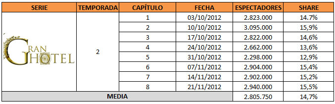 Sin embargo, y a pesar del descenso de más de cinco puntos respecto al inicio de la primera temporada, 'Gran Hotel' estrenó su segunda temporada con un potente 14,7%. Antena 3 sabía que podía hacer datos mejores e hizo amago de cambiarla de día, pero subió a un 15,9% y prefirieron mantenerla en miércoles.