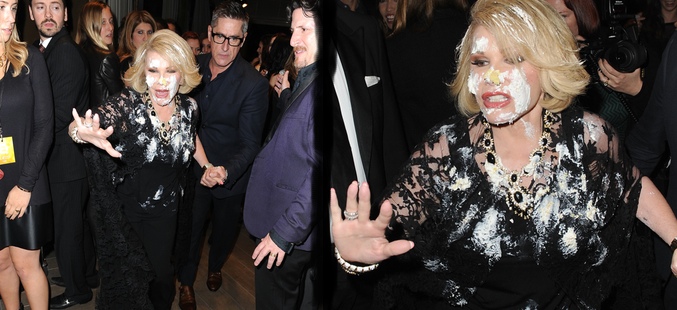 Desde septiembre del 2010 Rivers, que tiene 80 años, lidera semanalmente el programa 'Fashion Police' y lo hace acompañada de otros conductores. Juntos critican la vestimenta usada por las celebridades en eventos públicos. Pues bien, parece ser que a alguien no le han sentado muy bien sus críticas. Momentos después de la primera fotografía esta era la cara de Joan Rivers, completamente embadurnada de tarta.