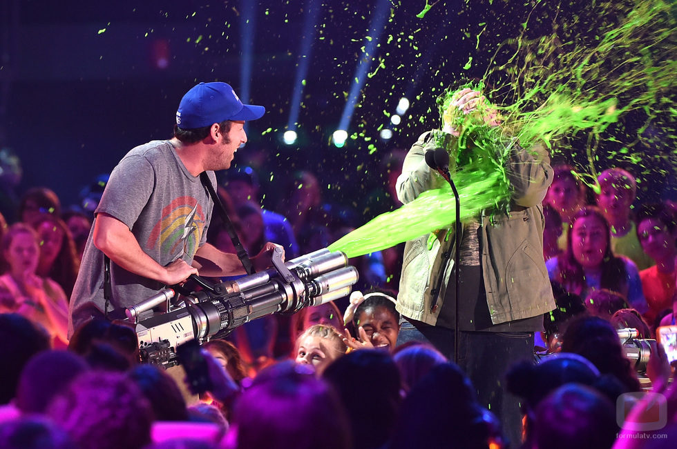 El actor Adam Sandler lanzando pringue verde a Josh Gad durante la celebración de los Nickelodeon's 28th Annual Kids' Choice Awards.