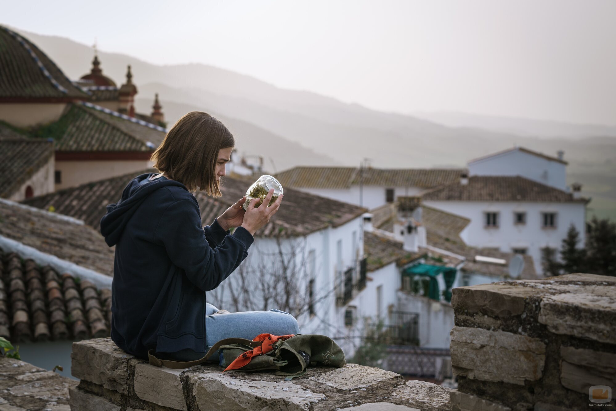 Sofía (Carla Campra) observa un bote de cristal, mientras está sentada en 'Feria: La luz más oscura', la ficción de Netflix producida por Filmax.