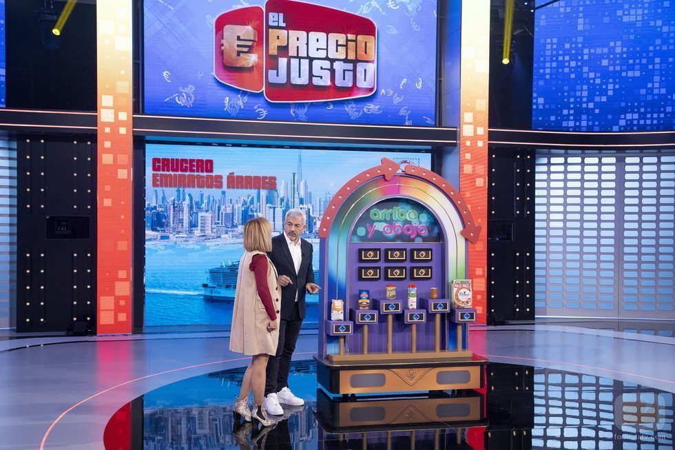 Carlos Sobera con una concursante de 'El precio justo' durante una de las pruebas