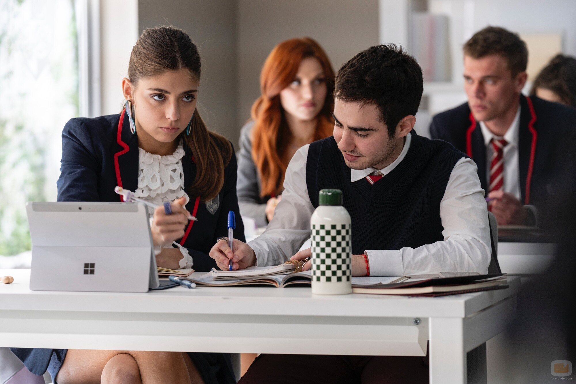 Fotografía de la octava temporada de 'Élite', la temporada final de la serie de Netflix, en las que aparecen Sara (Carmen Arrufat) sentada junto a Nicolás (Ander Puig) en la clase de Las Encinas.