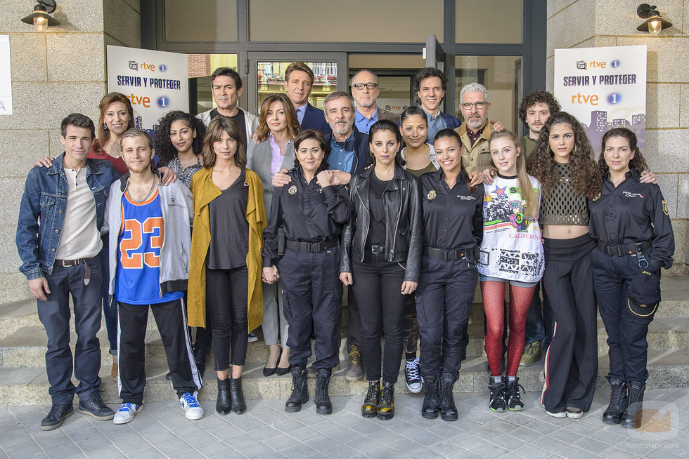 Los actores del drama policíaco de TVE, 'Servir y proteger' posan para la foto, entre ellos las protagonistas Luisa Martín y Andrea del Río.