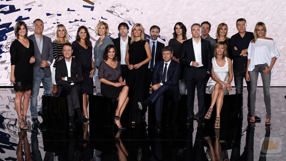 Los miembros de las cuatro ediciones de informativos de 'Antena 3 Noticias' y miembros de 'Espejo Público', como Susanna Griso, posan en la presentación de la temporada 2018-19.
