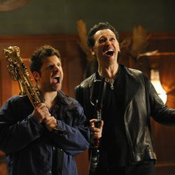 James Roday y Steve Valentine "armados" con un saxofón y una pistola de paintball en 'Psych'
