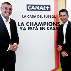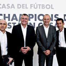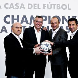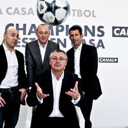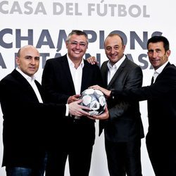 Maldini, Michael Robinson, Nacho Aranda y Carlos Martínez sonrientes en la presentación de la Champions