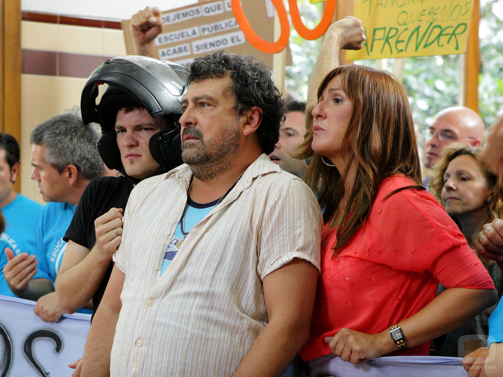 Javi, Tino y Alicia en la manifestación del colegio durante el nuevo episodio de 'Con el culo al aire' de Antena 3.