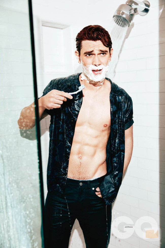 K.J Apa posa sexy afeitándose en la ducha para GQ