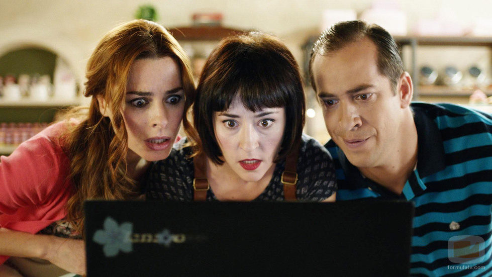 Laura (Begoña Maestre), Vicky (Elena Alferez) y Vicente (El Langui) miran sorprendidos el ordenador en 'Chiringuito de Pepe'.