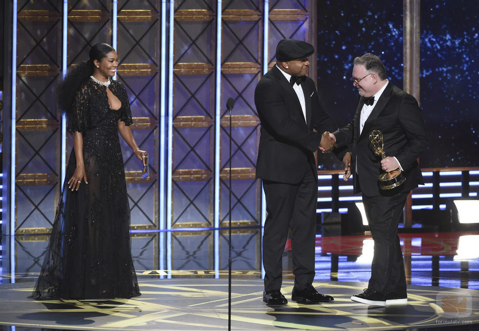 LL Cool J y Gabrielle Union entregan el premio a mejor guión de una serie drama a Bruce Miller por la ficción 'The Handmaid's Tale'.