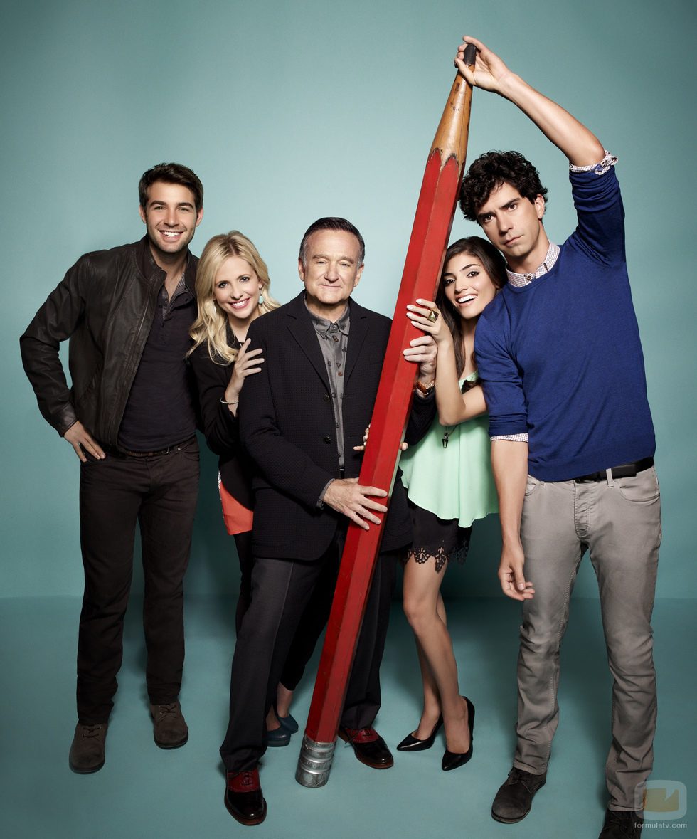 Los protagonistas de 'The Crazy Ones' Robin Williams y Sarah Michelle Gellar junto a Jimmy Wolk, Hamish Linklater, Amanda Setton.