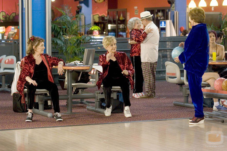 Rosa (Carmen Maura), Blanca (Lola Herrera) y Doroti (Concha Velasco) juegan a los bolos mientras Sofía (Alicia Hermida) baila.