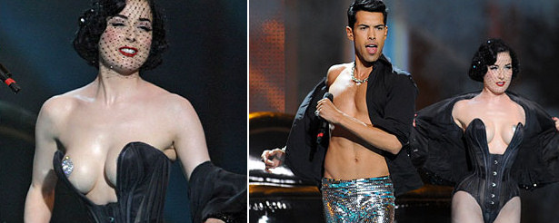 Varios medios de comunicación han publicado varias fotografías de la artísta con un pecho completamente al descubierto durante uno de los ensayos del número 'Miss Kiss Kiss Bang' del productor Alex Christensen, que interpreta el cantante de musicales Oscar Loya. Los diminutos cubrepezones de brillantes de Von Teese le han jugado una mala pasada sobre el escenario del Olympic Arena.