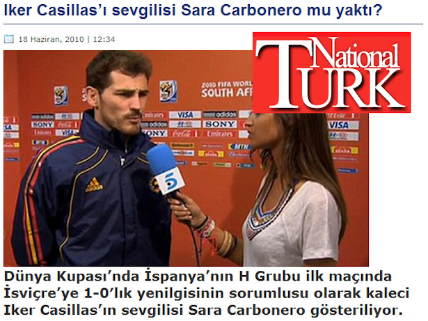 El National Turk señala cómo, mientras el resto de los miembros de la Selección están concentrados, Casillas es el único que tiene el privilegio de ver a su novia, y hasta ser entrevistado por ella.
