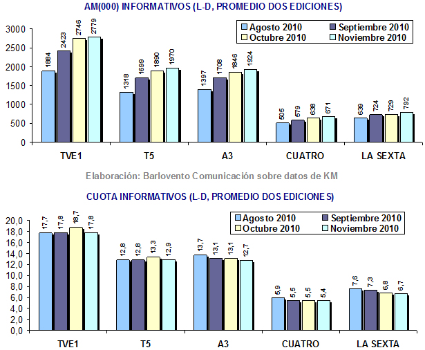 Según recoge Barlovento Comunicación en su último informe de audiencias, corespondiente a este pasado mes de noviembre, los informativos de La1 siguen siendo los más vistos por trigésimo noveno mes consecutivo en la ponderación de la audiencia media de las dos ediciones de mediodía y noche, con una diferencia de 809.000 espectadores sobre Telecinco, que se coloca como segunda opción.