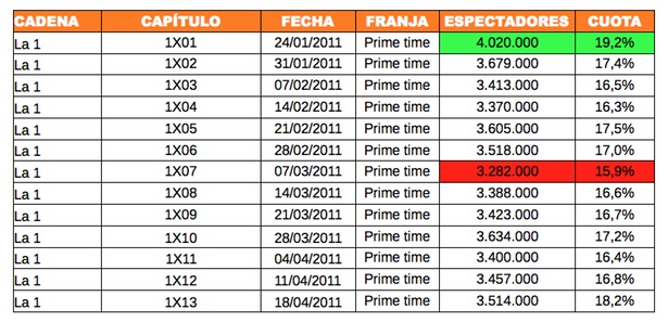 El capítulo más visto de la ficción sigue siendo el inicio de la temporada, único episodio que ha superado los 4 millones de espectadores. Este capítulo logró un 19,2%, coincidiendo con el inicio de 'El barco'. El último capítulo de la temporada logra el segundo mejor dato para la serie con un 18,2% de cuota.