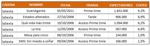 Por territorios, los mejores resultados de 'buenAgente' son los que laSexta obtuvo en Valencia (12,6%), Aragón (12%), Madrid (10,9%) y Castilla y León (10,9%).