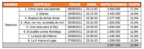 'Piratas' se estrenó en la cadena de Fuencarral el pasado 9 de mayo después de numerosos retrasos para asegurarse su buena posición. Finalmente, y con la expectación levantada por la trama de la serie y porque Pilar Rubio estuviese entre las filas del elenco, la nueva producción de Telecinco se estrenó ante un buen 17,2% y casi 3 millones y medio de espectadores.