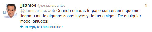 Dani Martínez, presentador de 'Otra movida', y JJ Santos, director de deportes de Telecinco y comentarista esta mañana de la final del Mundialito, han protagonizado una pequeña discusión en Twitter a raíz de un comentario del primero, que aseguraba que de doscientos comentarios que había recibido, ni uno le decía que le había gustado JJ.