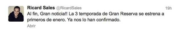 Nada se sabía del estreno de los nuevos capítulos de la ficción protagonizada por Paula Echevarría hasta que este pasado martes, 18 de diciembre, el actor Ricard Sales (Daniel Reverte) ha escrito lo siguiente en su cuenta oficial de Twitter: "Al fin. ¡Gran noticia! La tercera temporada de 'Gran Reserva' se estrena a primeros de enero. Ya nos lo han confirmado".