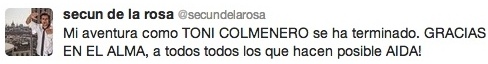 Secun de la Rosa ha abandonado su papel de Toni Colmenero en la serie 'Aída'. El popular hermano de Mauricio Colmenero conocido como Toni, que en más de una ocasión ha sacado de sus casillas al dueño del Bar Reinols por su ideología política y su orientación sexual, deja la famosa sitcom de Telecinco después de participar en ella como personaje secundario desde 2005. Así lo ha confirmado en Twitter, donde expresa la satisfacción que le ha provocado el personaje de Toni, aunque asegura que ya ha llegado el momento despedirse de él.