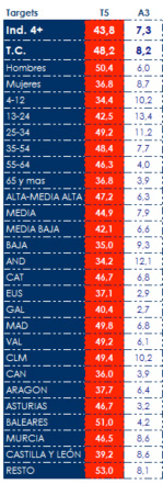 Arrasó con un 48,2% en target comercial, en todos los segmentos de espectadores, clases sociales y mercados geográficos, destacando el dato en hombres (50,4%), espectadores de 25 a 34 (49,2%) y de 35 a 54 años (48,4%). Alcanzó el minuto de oro a las 14:47 horas rozando los 6 millones de espectadores (5.998.000 y 46,1% de share).