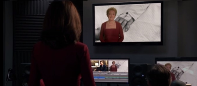 Todo termina de joderse cuando a muestran a Alicia el vídeo de campaña de Prady. Antes ella lo ha clavado llevando un vestido rojo que, creo, ya habíamos visto antes en 'The Good Wife' . En el publi-reportaje Frank Prady habla de su infancia y de la muerte de su padre. Cuando llega el testimonio de la madre de éste Alicia se espanta porque lleva el mismo vestido que ella ha utilizado para su propio, y sentido, vídeo.