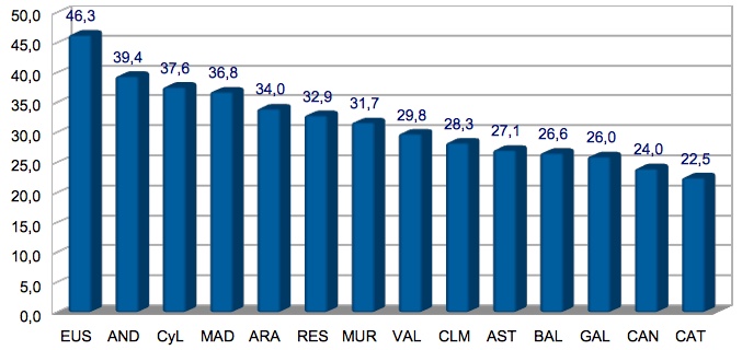 | AND | CAT | EUS | GAL | MAD | VAL | CLM | CAN | ARA | AST | BAL | MUR | CyL | RES | |