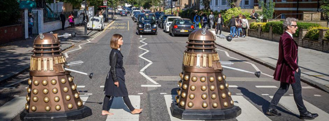 La vuelta de 'Doctor Who' está dejando más de un detalle para recordar. Sus dos protagonistas, Peter Capaldi y Jenna Coleman, junto a dos de los Daleks característicos de la serie han decidido desplazarse hasta Abbey Road para simular la famosísima portada de Los Beatles.